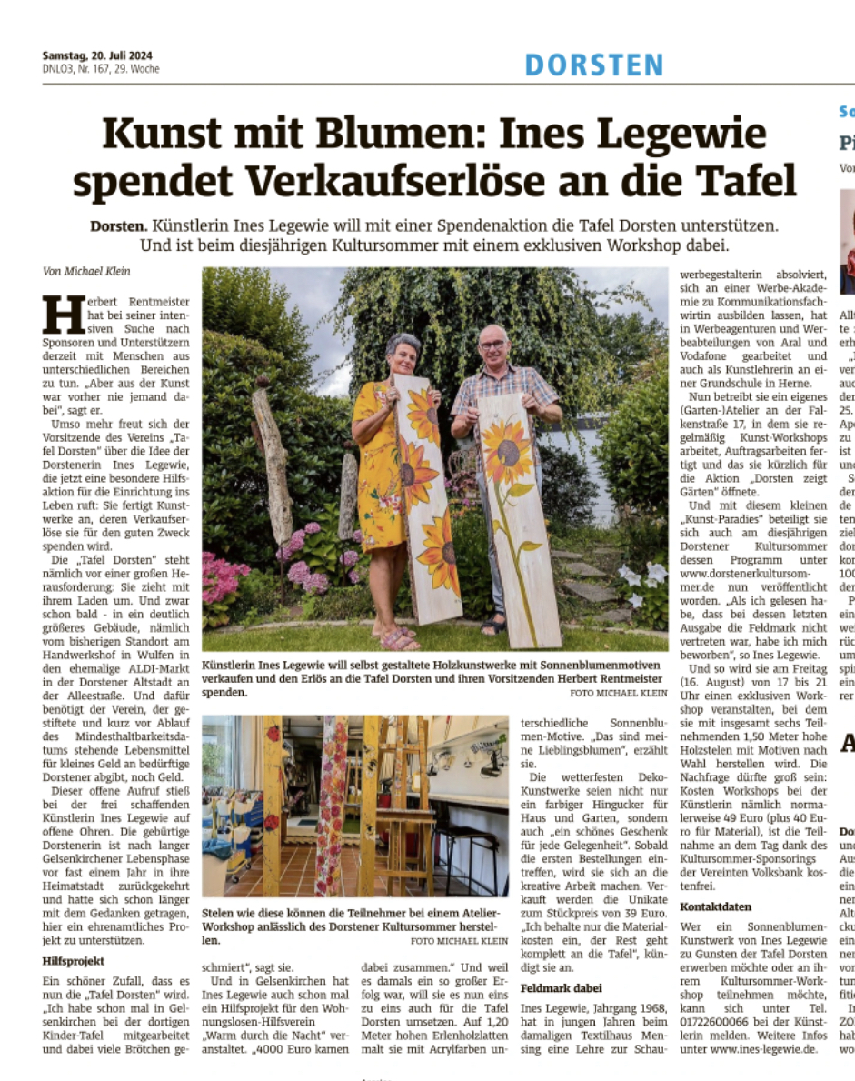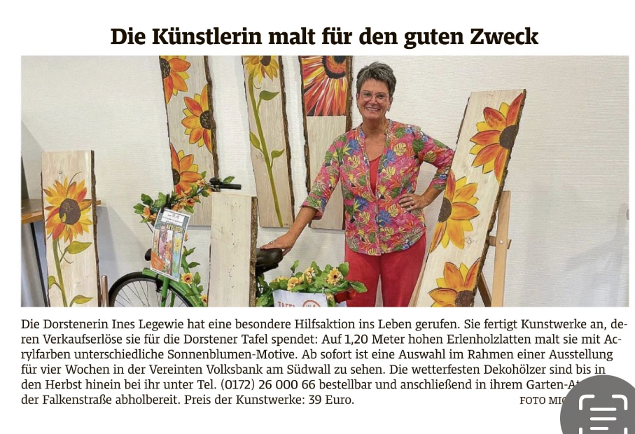 Ines unterrichtet verschiedene Deko-Stile auf und mit Holz oder Leinwand. Der Fokus ihrer Arbeit liegt überwiegend auf Acryl- und Ölfarbe. Auftragsarbeiten und die Erstellung fertiger Deko-Kunst gehörten zum täglichen Geschäft, natürlich auch die pausenlose Suche nach neuen Inspirationen. Sie unterstützt mit dem Verkauf ihrer Deko-Kunst Charity-Projekte der Dorstener Tafel, der Obdachlosenorganisation „Warm durch die Nacht“ und dem Friedensdorf Oberhausen.