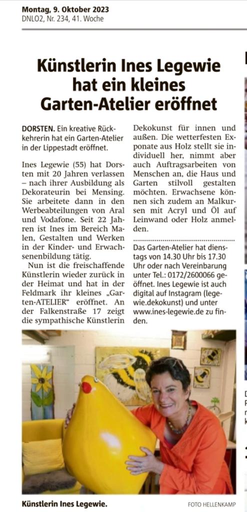 Seit 25 Jahren arbeite ich im eigenen Atelier (vorher in Gelsenkirchen) und seit September 2023 in Dorsten in meinem Garten-ATELIER. Mein Deko-Künstlerinnen Herz schlägt für Outdoor-Deko und ich bin glücklich, dass ich in Dorsten mein Paradies schaffen konnte. Mein absoluter Wohlfühlort hält viel Platz für Kreativität, tollen Lichtverhältnissen und allen Komfort bereit, den wir zum „bindungslosen Ideen verwirklichen“ nutzen können. Eine Panoramascheibe lässt in den Garten träumen, während im Hintergrund entspannte, leise Klaviermusik läuft. Manchmal taucht kurz ein lautes Geräusch auf, um z.B. das richtige Loch in dein Deko-Holz zu bohren oder eine andere Idee zu verwirklichen. Das Garten-ATELIER hält u.a. auch ganz viel handwerklichen Input bereit. So kannst du direkt deine fertige Deko-Kunst zu Hause aufhängen, befestigen, wetterfest lackieren, in Szene setzen.